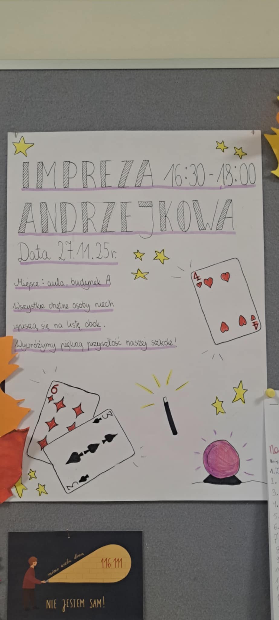 27 listopada z okazji andrzejek Samorząd Uczniowski we współpracy ze Szkolnym Kołem Wolontariatu przygotował liczne atrakcje. Osoby uczestniczące w wydarzeniu poznały zwyczaje polegające na wróżeniu ze skórki jabłka, przekłuwaniu serca z imionami czy laniu wosku. Uczniowie i uczennice zadbali o pomysłowe (i wyłącznie pomyślne) wróżby do wylosowania lub odczytania z kart Dixit. Nie zabrakło także poczęstunku.