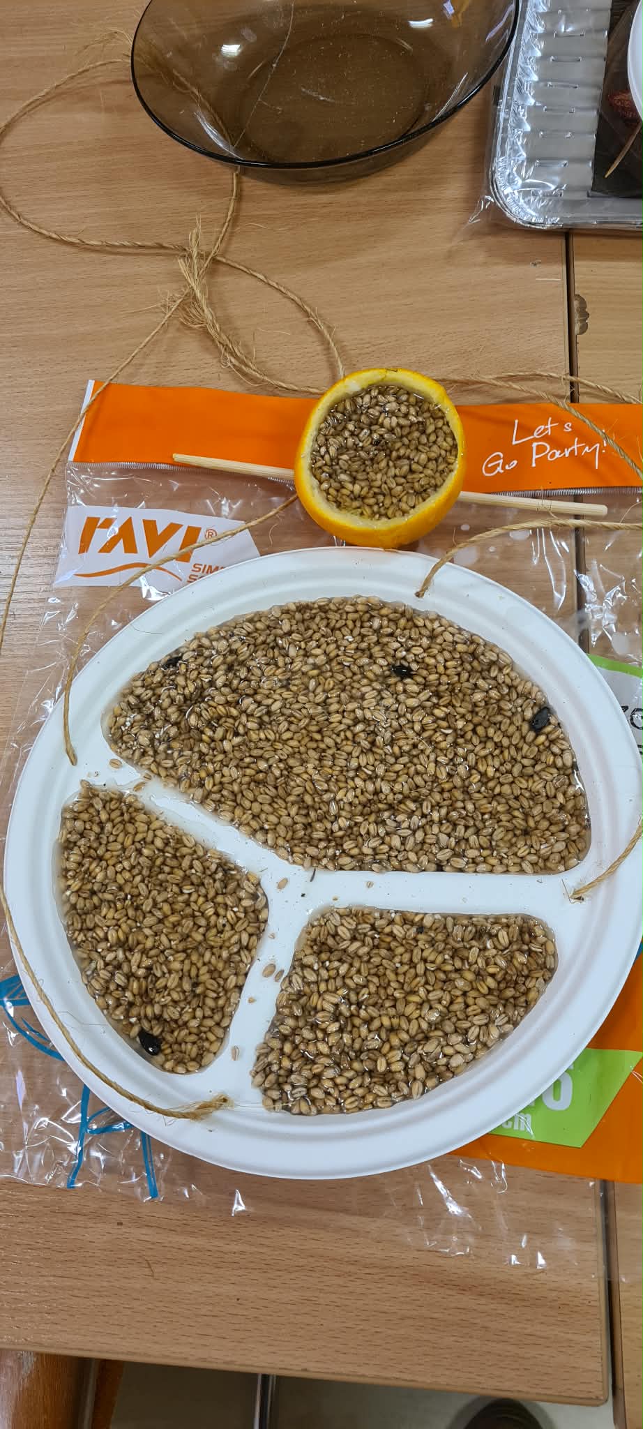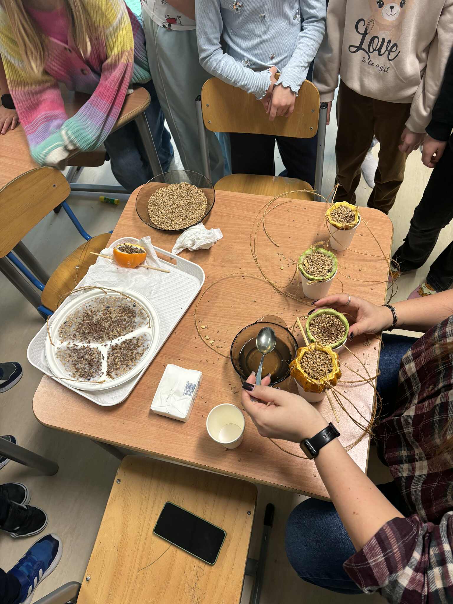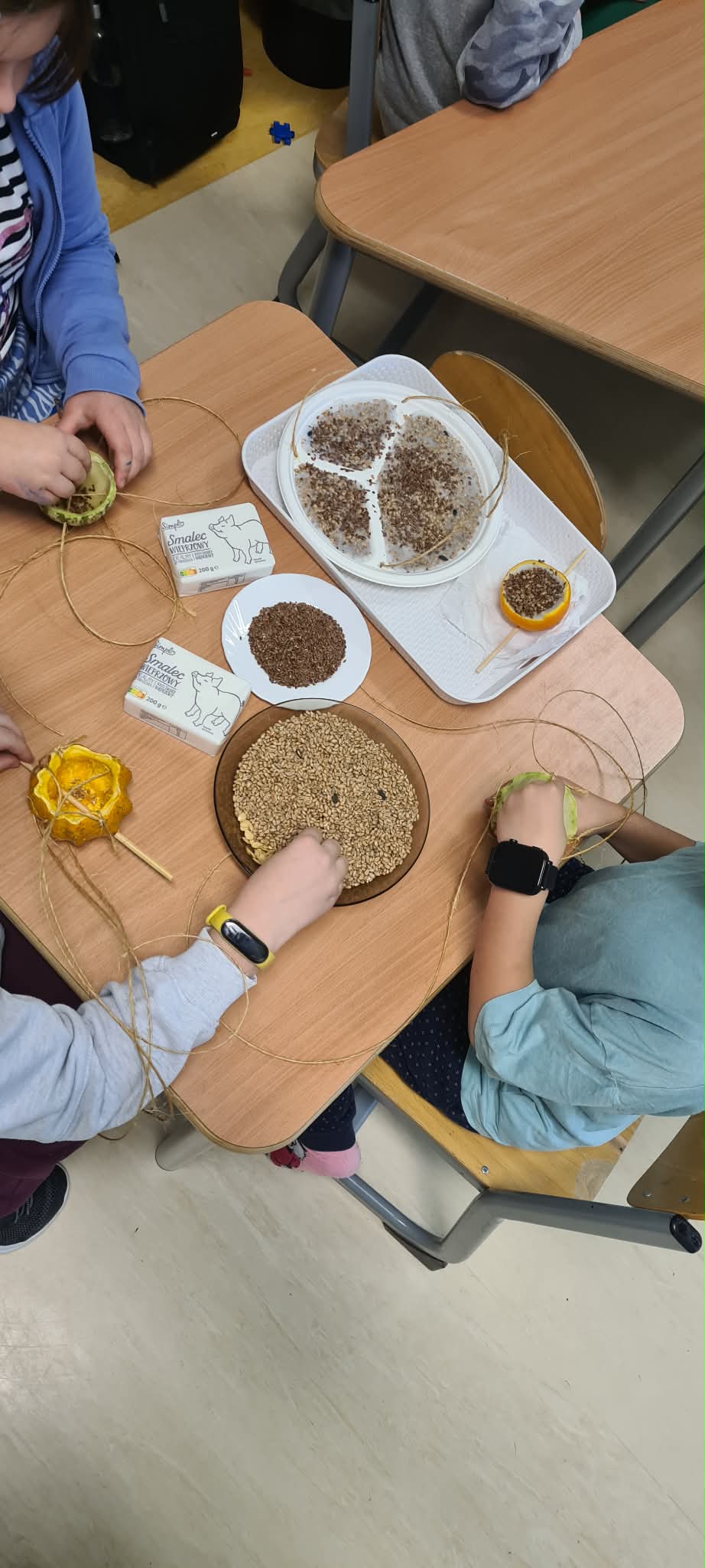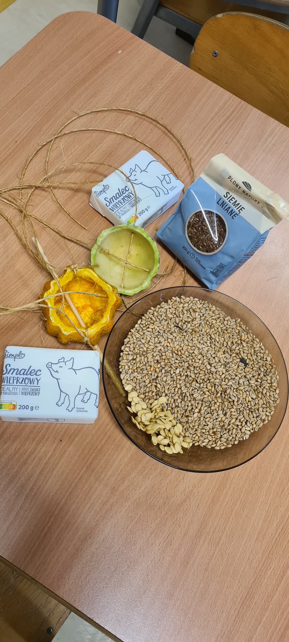 Dzieci w świetlicy szkolnej wykonały ekologiczne karmniki dla ptaków. Do ich przygotowania wykorzystano naturalne oraz materiały z recyklingu, takie jak pomarańcze, dynie, plastikowe talerzyki, ziarna, smalec i sznurek jutowy. Zajęcia były okazją do rozwijania kreatywności, zdolności manualnych oraz kształtowania postaw proekologicznych i troski o zimujące ptaki.