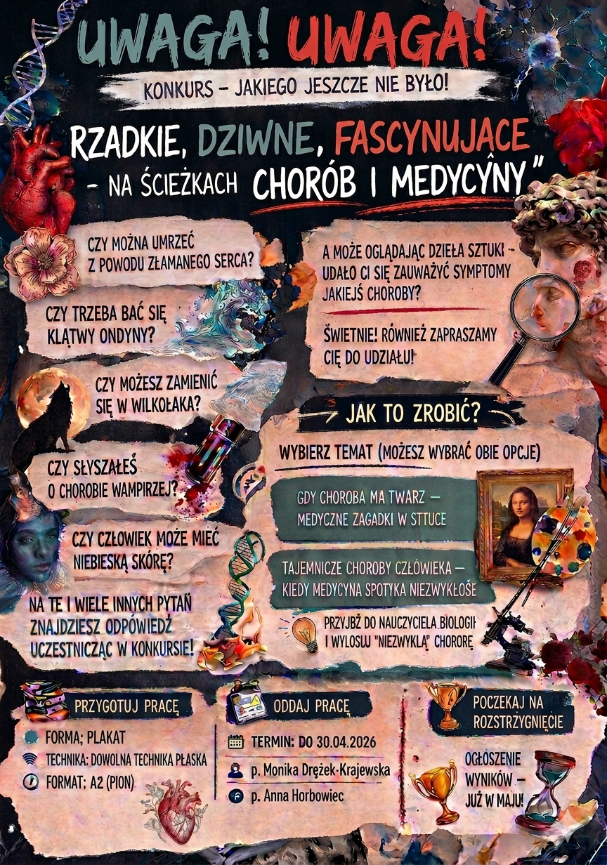 Szkolny Konkurs Biologiczno – Plastyczny „Rzadkie, dziwne, fascynujące – na ścieżkach chorób i medycyny”, dla uczniów klas 5-8, nauczyciele odpowiedzialni: p. Anna Horbowiec i p. Monika Drężek Krajewska