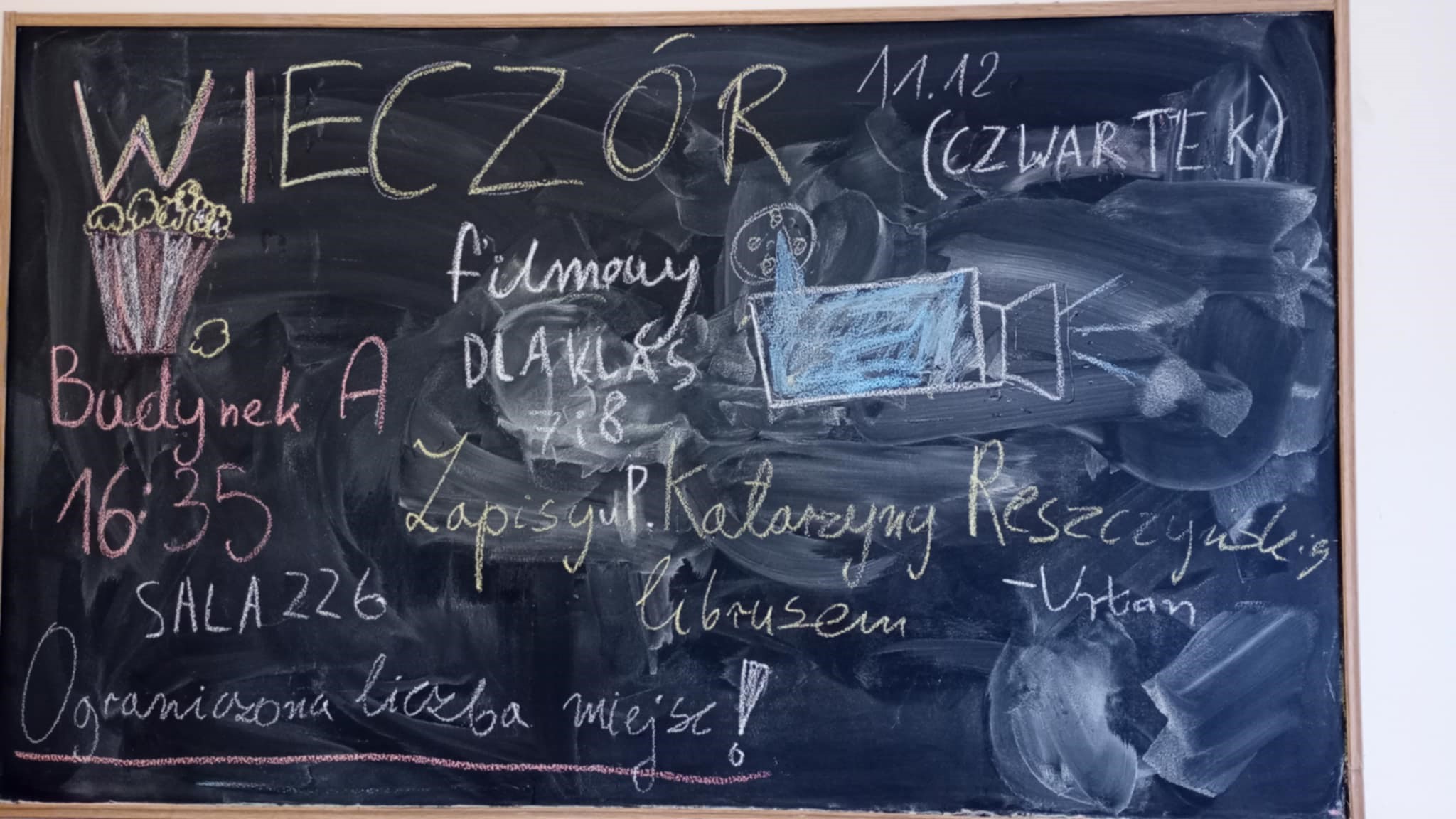 Przewodniczący Samorządu Uczniowskiego, Maciek z klasy VIII b, nie zapomina o swoich obietnicach wyborczych! 11 grudnia zaprosił kolegów i koleżanki z klas VII-VIII na wieczór filmowy, podczas którego młodzież – zgodnie ze świąteczną tradycją – obejrzała ,,Kevina samego w domu”. W sali 226 jeszcze następnego dnia czuć było zapach pierników i prażonej kukurydzy.